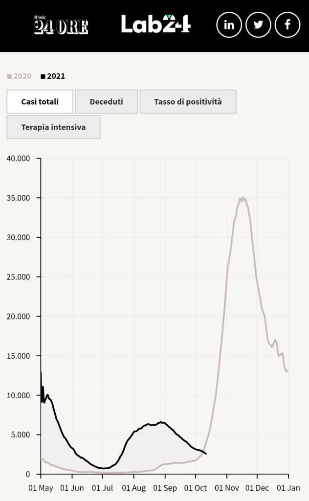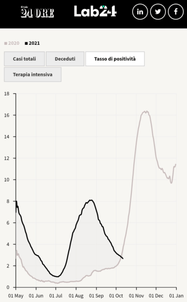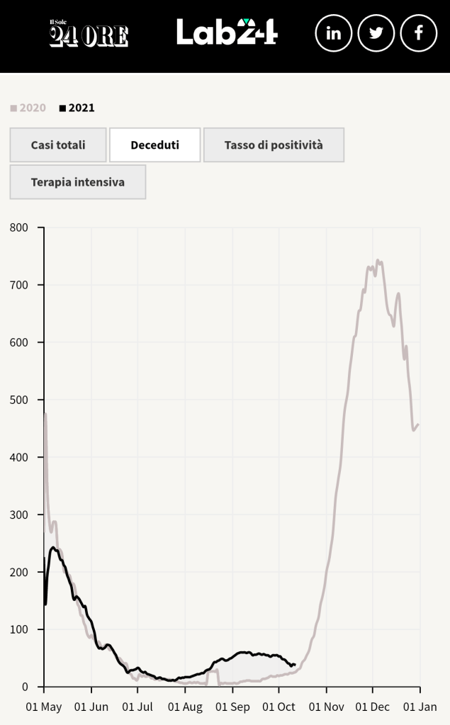 Cercando di concentrarci sui numeri, e sperando che questi sia corretti (le polemiche non mancano neanche in questo caso tra chi li ritiene gonfiati piuttosto che usati a comodo a seconda della tesi da sostenere), vediamo di seguito i grafici de Il Sole 24 Ore Lab elaborati sui dati Iss in modo da avere un confronto tra il 2020 ed il 2021 sull’andamento della pandemia.