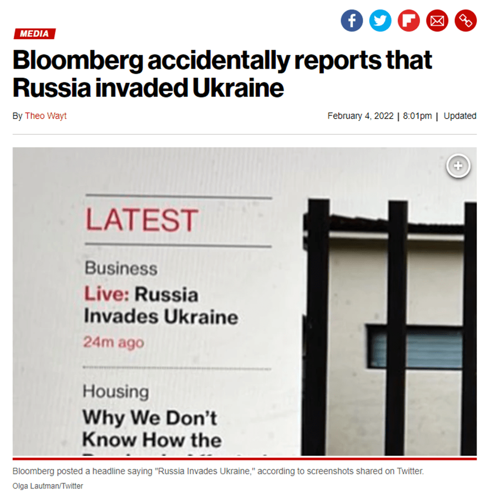 Ancora, il colosso dell’informazione Bloomberg, ha annunciato l’invasione dell’Ucraina da parte della Russia, lasciando il titolo errato online per circa mezz’ora a cui ha poi fatto seguito una nota di scuse: