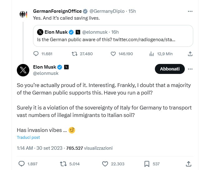 Elon Musk “litiga” con la Germania in una discussione sui migranti e sugli sbarchi a Lampedusa.