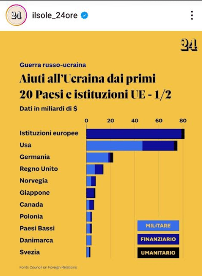 Il Sole 24 Ore ha redatto una classifica dei primi 20, indicando anche la tipologia di aiuto tra militare, finanziario ed umanitario. Di seguito i grafici: